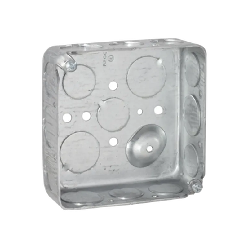 Caja cuadrada de 4 x 4" con múltiples entradas, ideal para instalaciones eléctricas.
