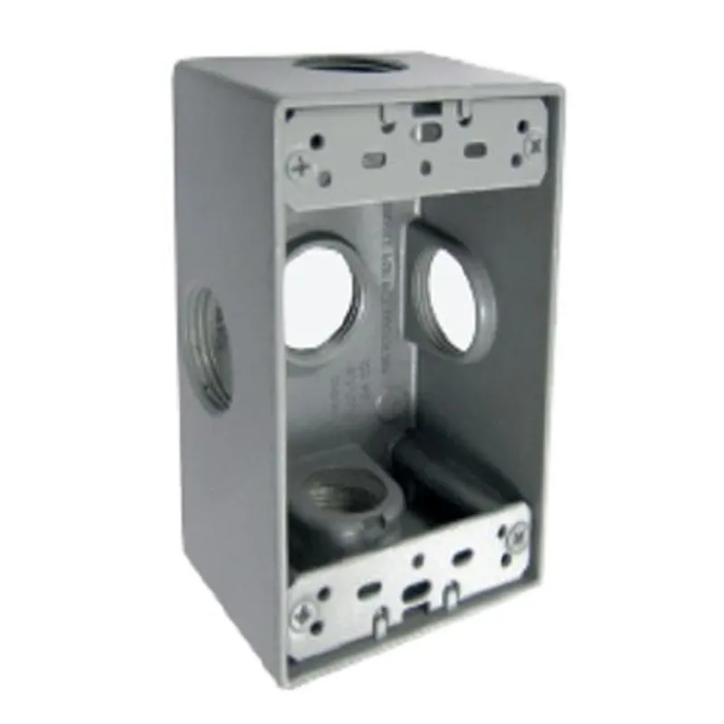 Caja rectangular de aluminio con 5 entradas para uso en exteriores, ideal para instalaciones eléctricas.