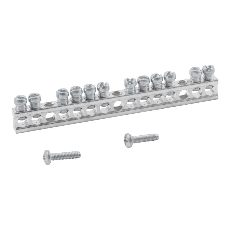 Barra de tierra de aluminio para centro de carga QO. Sujeta cables con tornillos; 12 orificios.