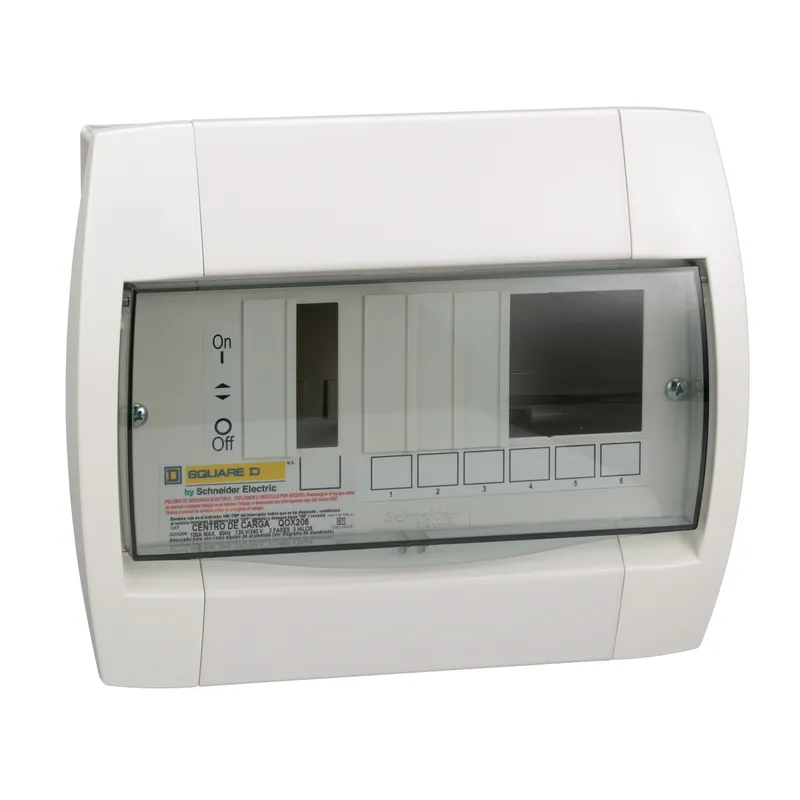 Centro de carga tipo QOX 2+6 polos para sobreponer o empotrar, instalado como un medio de desconexión principal o como centro de carga de circuitos derivados para controlar y distribuir electricidad en un hogar