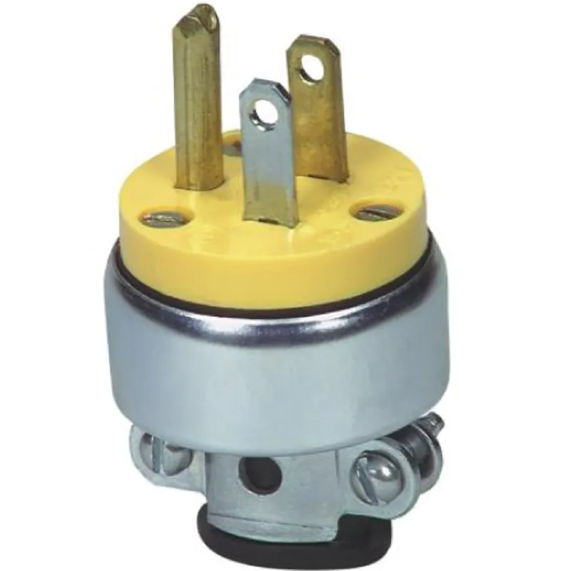 Clavija de vinil blindada de 15A y 125V con estilo NEMA 5-15P en color amarillo, ideal para aplicaciones eléctricas.