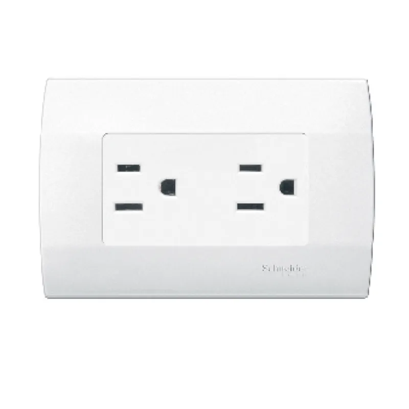 Toma de corriente dúplex en color blanco para conectar 2 clavijas. Incluye placa de 3 X 1 módulos blanca para un acabado estético, ordenado y profesional en la instalación