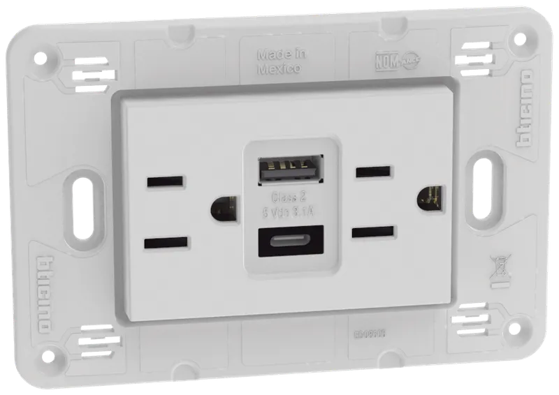 Tomacorriente Dúplex 2P +T con protección infantil 15A, 125V~y con 2 cargadores USB A+C 3.1A- 5Vcd, 3 módulos, Blanco