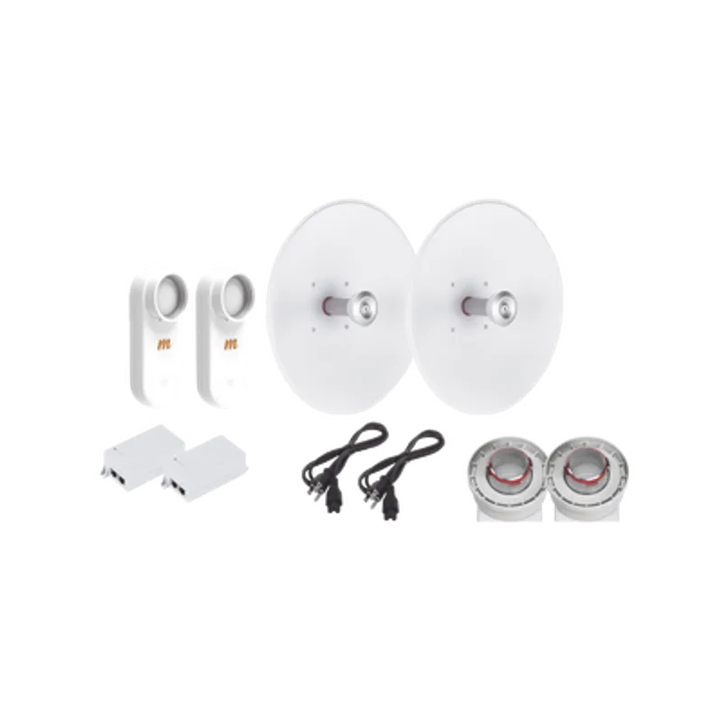 Enlace completo de 2 radios C5X con antenas UD-TP-27 (27 dBi), rango de frecuencia extendida (5.1 a 6.4 GHz), incluye inyector POE y cable de alimentación y adaptador para la antena