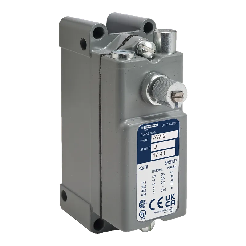 Interruptor de límite Schneider modelo 9007AW16. Dimensiones 49.161×7.62×19.355; peso 0.566991.