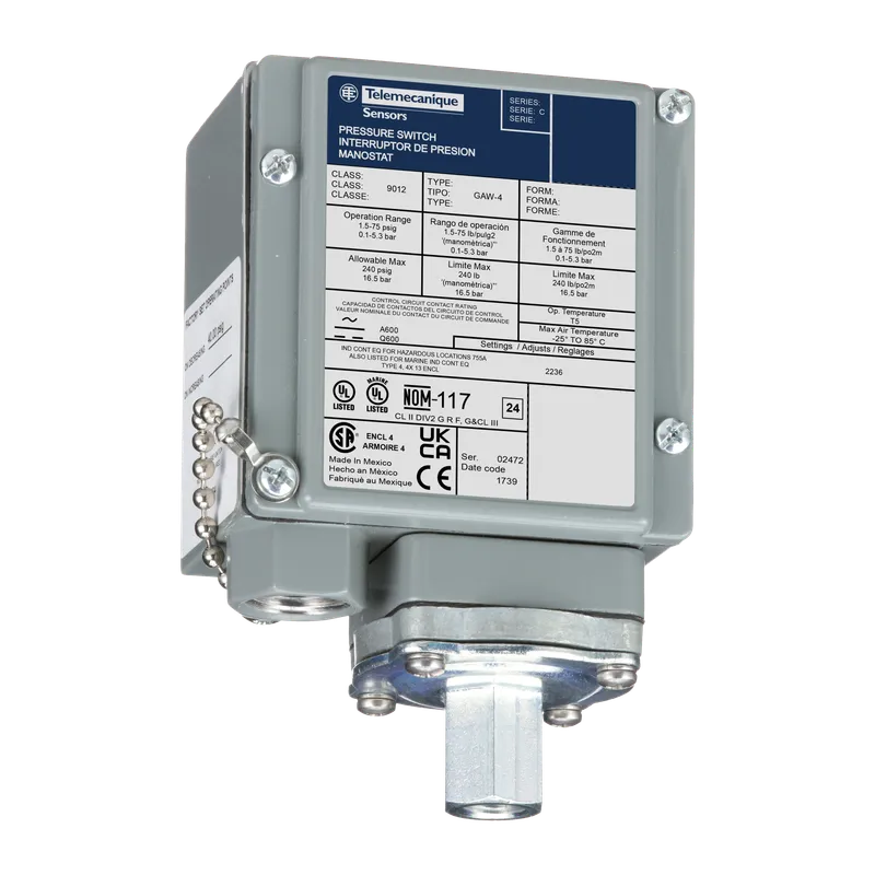 Interruptor de presión SCHNEIDER para control de presión; dimensiones 25.4×17.018×12.7, peso 1.284