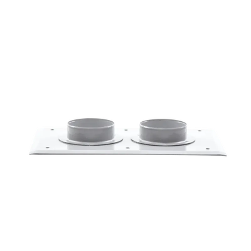 Placa pasamuro de aluminio gris con 2 puertos de 4". Resistente al agua con estándar IP66 para uso versátil.