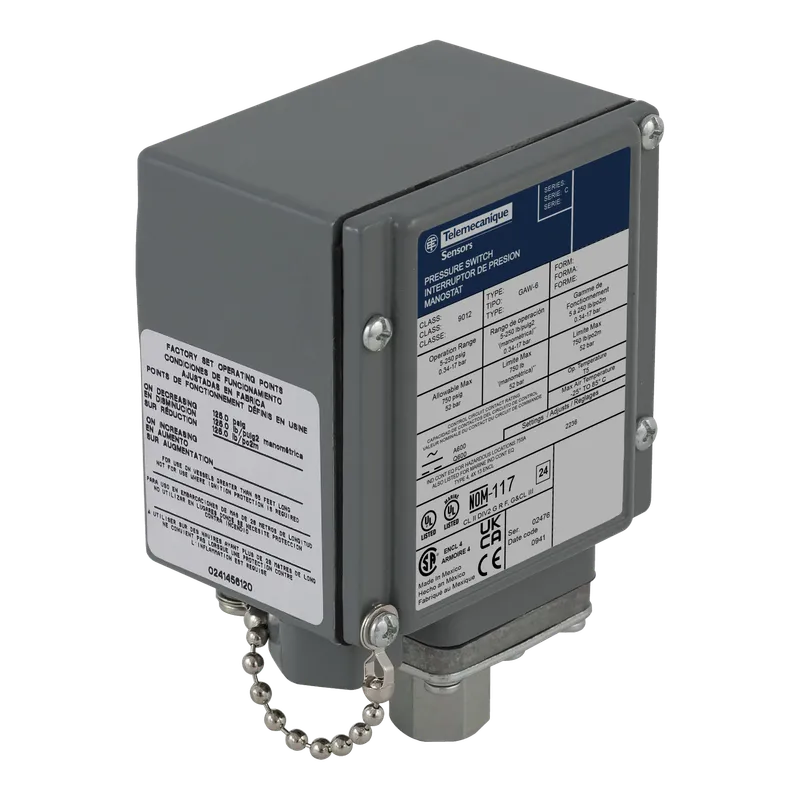 Presostato Schneider Clase 9012, interruptor para control de presión. Dimensiones 25.9×16.8×13.2.
