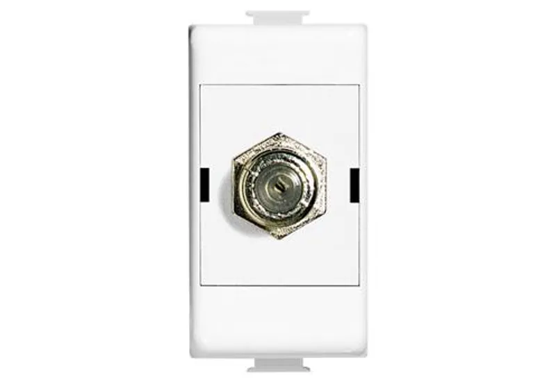 Toma de TV de 1 módulo en color blanco, fabricada en resina ABS. Ideal para líneas Quinziño MX.