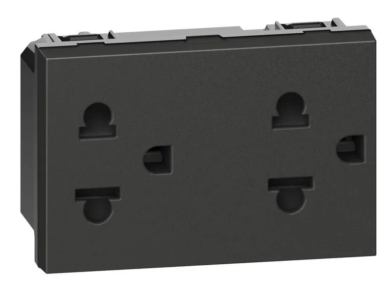 Tomacorriente euroamericana duplex 2P+T con protección infantil color negro 3 mód. 16A, 127-250V