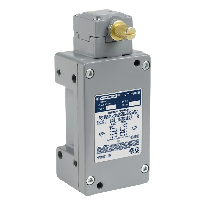Interruptor de límite Schneider 10 A para control de posición y señalización.